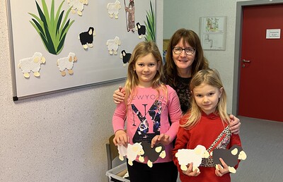 An der Volks­schule in Gam­litz be­ginnt ein gu­ter Mor­gen mit viel Kre­a­ti­vi­tät. Zur Bi­bel­stel­le "Der gu­te Hirt" ent­stand die­ses tol­le Wand­bild.