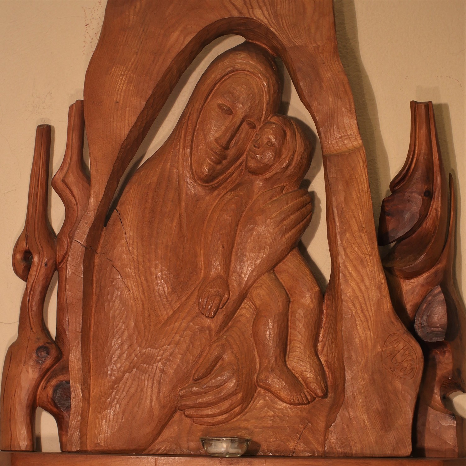 Das geschnitzte Marienbild mit dem Jesus-Kind an der rechten Außenwand in Form eines großen Medaillons bringt einen vertrauensvoll-freundlichen Ton in den Sakralraum, der ansonsten von der Aufforderung zur tätigen Nächstenliebe geprägt wird! Gleichzeitig drücken die Bildnisse aber auch aus, dass jeder, auch der Ärmste, der Verzweifelte, der Heruntergekommene hier Gemeinschaft finden kann.