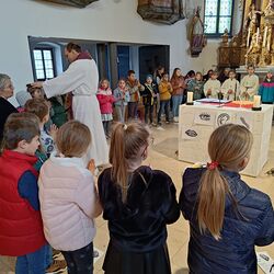 Mit einem königlichen Einzug begann der Sternsingergottesdienst am Dreikönigstag. Diakon Michi Zepf zelebrierte die Wort-Gottes-Feier mit Kommunionspendung zum „Hochfest der Erscheinung des Herrn“. In vielen Texten und Liedern kam das Anliegen der Dreikönigsaktion zum Ausdruck. Noch einmal trat eine Sternsingergruppe auf und präsentierte ihre Botschaft. Die Segnung des Dreikönigswassers und des Salzes, das auch zum Mitnehmen angeboten wurde, bildete zusammen mit der Allerheiligenlitanei, vorgetragen von Martin Kirchberger, den feierlichen Abschluss der WGF.